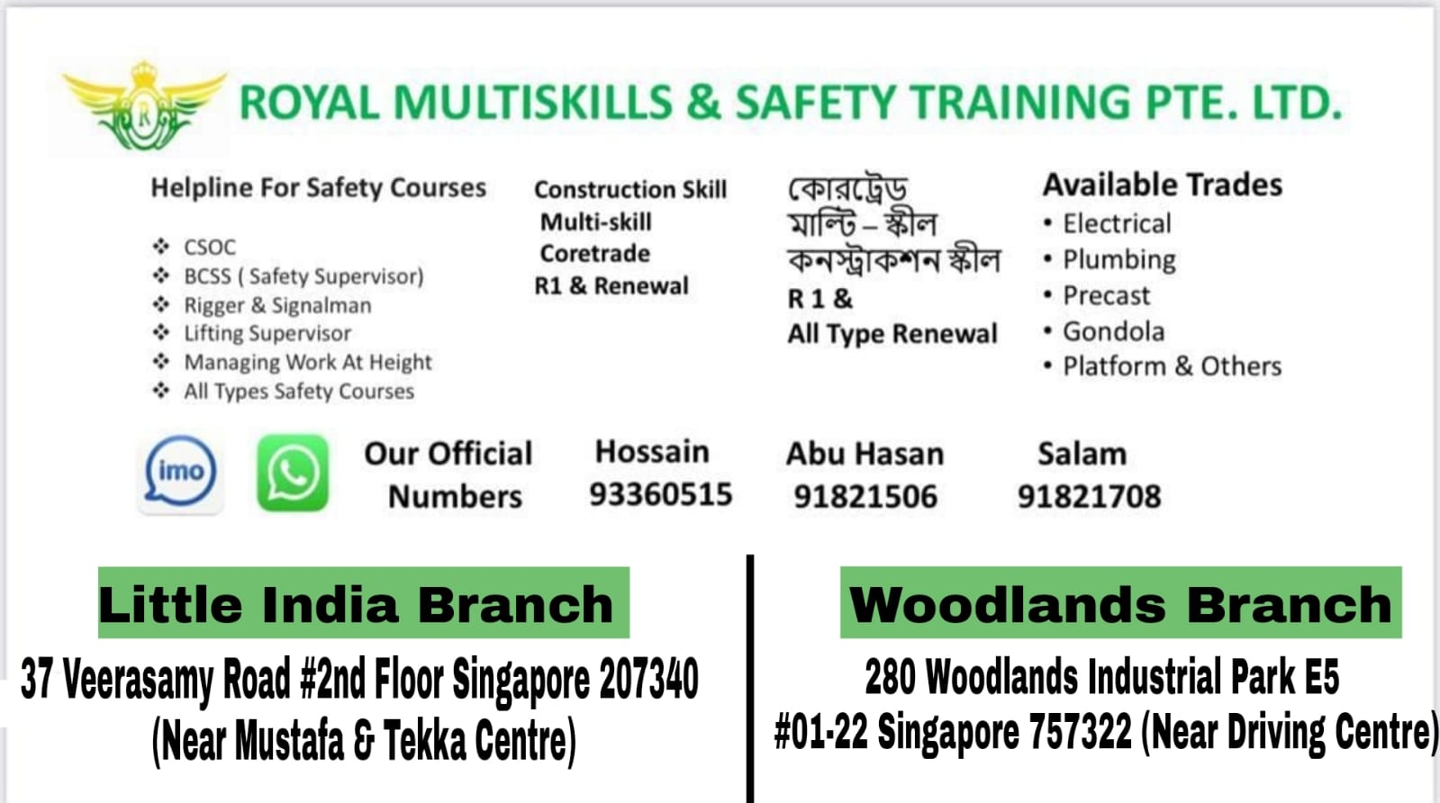 ROYAL MULT-SKILLS & SAFETY TRANING PTE. LTD is a well-known construction skill training centre. Providing construction skills, multi-skill, core trade, R 1 & low levy courses on different trades with proper safety guidelines & sophisticated training environment where trainees can get quality training.